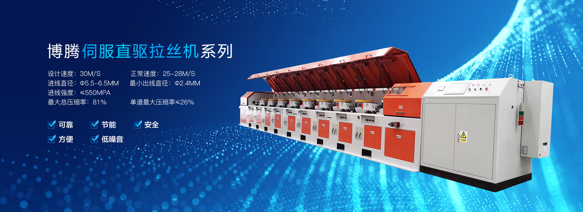 主要產品有直連式拉絲機+高速直線鍍銅焊絲生產線、CRZ-3000型全自動焊絲層繞機、各種規格直進式拉絲機(LSJ300~LSJ800),SDJ-300型砂帶拋光機,各種規格的工字輪收、放線機、鋼帶復繞機等。直進式拉絲機技術經不斷改進和完善,適用于多種領域,主要用于鍍鋅鐵絲、胎圈鋼絲、簾線鋼絲、鋁焊絲(含鋁鎂合金絲)、不銹鋼絲、藥芯焊絲、氣體保護焊絲等金屬線材。